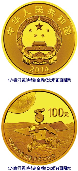 中国人民银行定于2014年1月22日发行中国探月首次落月成功金银纪念币一套。该套纪念币共2枚,其中金币1枚,银币1枚,均为中华人民共和国法定货币。 一、纪念币图案 (一)正面图案。 该套金银纪念币正面图案均为中华人民共和国国徽,并刊国名、年号。 (二)背面图案。 1/4盎司圆形金质纪念币背面图案为“月球车”在月面巡视勘测造型,配以地球组合设计,并刊“中国探月首次落月成功纪念”字样及面额。 1盎司圆形银质纪念币背面图案为“着陆器”与“月球车”在月面互拍造型,配以地球组合设计,并刊“中国探月首次落月成功纪念”字样及面额。 二、纪念币规格和发行量 (一)1/4盎司圆形金质纪念币为精制币,含纯金1/4盎司,直径22毫米,面额100元,成色99.9%,最大发行量10000枚。 (二)1盎司圆形银质纪念币为精制币,含纯银1盎司,直径40毫米,面额10元,成色99.9%,最大发行量20000枚。 三、该套金银纪念币由深圳国宝造币有限公司铸造,中国金币总公司总经销。 中国人民银行