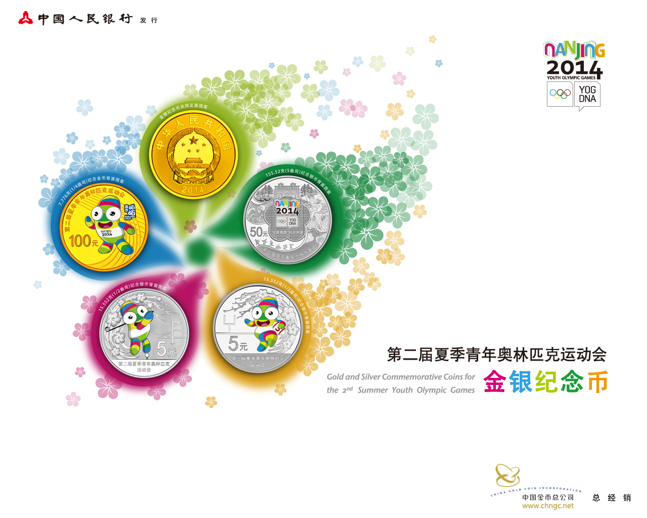 中国人民银行公告(2014)第2号 中国人民银行定于2014年2月28日发行第二届夏季青年奥林匹克运动会金银纪念币一套。该套纪念币共4枚,其中金币1枚,银币3枚,均为中华人民共和国法定货币。 一、纪念币图案 (一)正面图案。 该套金银纪念币正面图案均为中华人民共和国国徽,并刊国名、年号。 (二)背面图案。 7.776克(1/4盎司)圆形金质纪念币背面图案为标准吉祥物造型衬以跑道图案组合设计,并刊“第二届夏季青年奥林匹克运动会”字样及面额。 155.52克(5盎司)圆形银质纪念币背面图案为会徽衬以南京城门、云锦图案等组合设计,并刊“第二届夏季青年奥林匹克运动会”字样及面额。 15.552克(1/2盎司)圆形银质纪念币背面图案之一为高尔夫球运动吉祥物造型,衬以装饰梅花图案等组合设计,并刊“第二届夏季青年奥林匹克运动会”字样及面额。 15.552克(1/2盎司)圆形银质纪念币背面图案之二为橄榄球运动吉祥物造型,衬以装饰梅花图案等组合设计,并刊“第二届夏季青年奥林匹克运动会”字样及面额。 二、纪念币规格和发行量 (一)7.776克(1/4盎司)圆形金质纪念币为精制币,含纯金7.776克(1/4盎司),直径22毫米,面额100元,成色99.9%,最大发行量10000枚。 (二)155.52克(5盎司)圆形银质纪念币为精制币,含纯银155.52克(5盎司),直径70毫米,面额50元,成色99.9%,最大发行量2000枚。 (三)15.552克(1/2盎司)圆形银质纪念币为精制币(2枚),每枚含纯银15.552克(1/2盎司),直径33毫米,面额5元,成色99.9%,最大发行量各20000枚。 三、该套金银纪念币分别由深圳国宝造币有限公司、沈阳造币有限公司和上海造币有限公司铸造,中国金币总公司总经销。 中国人民银行 2014年2月14日