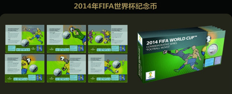 为纪念2014年巴西世界杯的举办,中国金币总公司特进口2014年FIFA世界杯纪念币与历届冠军国流通币组合装帧成册(6 枚巴西纪念币+8 枚冠军国流通币)。该珍藏册由国际足球联合会(FIFA)授权,中国金币总公司出品,德国MDM公司装帧,中国大陆地区仅发售2000套,中钱投资有限公司为深圳地区的唯一经销商。 (一)2014巴西世界杯纪念币:为纪念2014年FIFA世界杯足球赛,巴西铸币局发行并铸造了6枚世界杯纪念币。正面图案均为巴西地图剪影、2014世界杯会徽及面额,背面图案分别为防守(Defense)、胸部停球(Chest)、射门(Goal)、传球(Pass)、头球(Head)和盘带(Dribbling)的球员动作造型。该套纪念币面额均为2雷亚尔(REAL),材质均为铜镍合金。