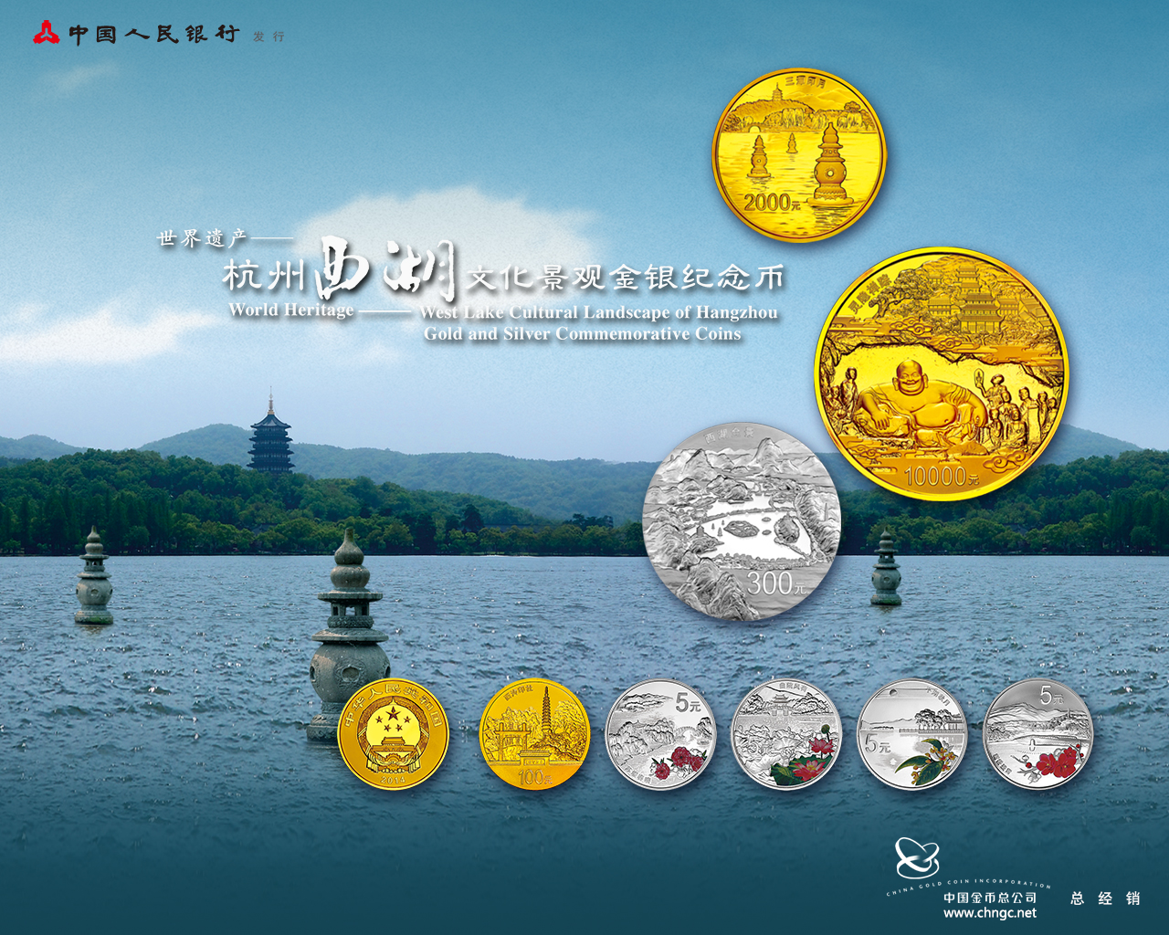 中国人民银行定于2014年5月30日发行世界遗产——杭州西湖文化景观金银纪念币一套。该套纪念币共8枚,其中金币3枚,银币5枚,均为中华人民共和国法定货币。