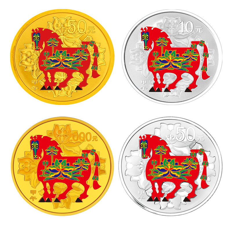 中国人民银行定于2013年10月10日发行2014中国甲午(马)年金银纪念币一套。该套纪念币共16枚,其中金币9枚,银币7枚,均为中华人民共和国法定货币。该套金银纪念币正面图案均为中华人民共和国国徽衬以连年有余吉祥纹饰,并刊国名、年号。背面图案均为中国民间传统装饰马造型衬以吉祥纹饰(局部彩色),并刊面额及“甲午”字样。 |