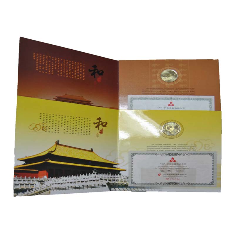 第一组、第二组“和”字币 2009年11月26日,中国人民银行发行“和”字书法——篆书普通纪念币(第一组)。该币面额为1元,直径为25毫米,材质为黄铜合金,发行数量1000万枚。正面图案为国徽和“壹圆”字样,内缘上方刊“中华人民共和国”国名,内缘下方刊“2009”年号。该普通纪念币背面主景图案为篆书“和”字,左下方为以多种字体书写的“和”字,背景以书法的飞白手法衬托。 2010年11月9日,中国人民英航发行“和”字书法——隶书普通纪念币(第二组)。该币面额均为1元,直径均为25毫米,材质均为黄铜合金,发行数量1000万枚。正面图案为国徽,其上方刊“中华人民共和国”国名,下方刊“壹圆”面额和“2010”年号;背面主景图案为隶书“和”字,上方为多种字体书写的“和”字,背景以书法的飞白手法衬托。 |