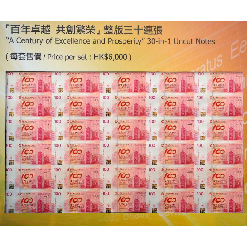 中国银行100周年纪念钞(香港)色调、尺寸与2010年系列香港100元港币一直,印量为200万张,其中「百年卓越 共创繁荣」整版三十连张共2万套。该中国银行100周年纪念钞(香港)系列纪念钞,即「百年荣耀全球服务」单钞、「百年传承基业长青」三连张和「百年卓越 共创繁荣」整版三十连张三个品种中,将选出168套慈善珍藏版,以竞投方式发售。