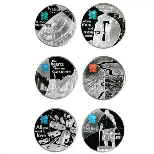 2011年6月,2012年伦敦奥运会系列纪念币中国发售。 该系列纪念币由伦敦奥组委和英国皇家造币厂共同推出,中国金币总公司作为中国贵金属纪念币惟一的总经销单位,以北京奥运币成功运作经验获得该系列纪念币在中国大陆及港澳台地区的销售授权。 据了解,中国金币总公司首批引进的2012年伦敦奥运会纪念币共有3个系列5种产品组合。它们分别是:“欢庆英国”系列6枚银币套装、“欢庆英国”系列18枚银币套装、“更快”系列3枚金币套装、体育项目29枚铜镍合金普通纪念币套装以及由“欢庆英国”系列中“英国记忆”主题6枚银币和“更快”系列2枚金币组成的产品套装。 英国皇家造币厂为2012年伦敦奥运会发行的系列纪念币以记忆、风情和精神为主题,涵盖了英国名人伟事、奇观美景和精神风貌,并以奥运精神“更高、更快、更强”为设计灵感,形成了独具特色的产品组合。 此系列纪念币系英国皇家造币厂制造,纯银精制,其设计涵盖了英国的名人伟业事、奇观美景和精神风貌。这些纪念币不仅展示了英国的辉煌与风采,更见证了世界体育史上一次具有里程碑意义的盛会,以及举国上下为积极筹备2012年伦敦奥运会及残奥会所做出的努力。 本系列纪念币为英国法定货币,面额5英镑,有谢恩.格里夫斯与英国皇家造币厂雕塑团队共同设计完成,经2012年伦敦奥运会及残奥会组委会(LOCOG)、国际奥委会(IOC)正式批准。每枚银币都带有彩色2012年伦敦奥运会会徽,并附有英国著名诗人、作家的名言警句。